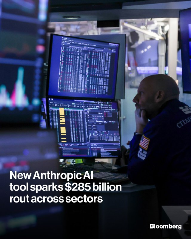 A new AI automation tool from Anthropic sparked a $285 billion rout in stocks across the software, financial services and asset management sectors on Tuesday as investors raced to dump shares with even the slightest exposure.https://bloom.bg/49UxtGo📷: Michael Nagle/Bloomberg