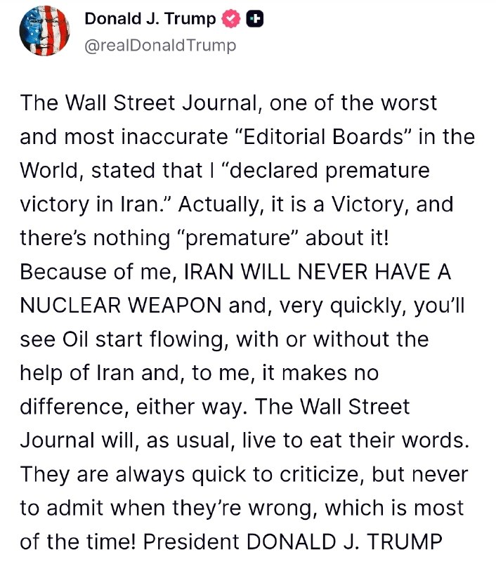 Trump:The Wall Street Journal, one of the worst and most inaccurate “Editorial Boards” in the World, stated that I “declared premature victory in Iran.”Actually, it is a Victory, and there’s nothing “premature” about it! Because of me, IRAN WILL NEVER HAVE A NUCLEAR WEAPON and, very quickly, you’ll see Oil start flowing, with or without the help of Iran and, to me, it makes no difference, either w...