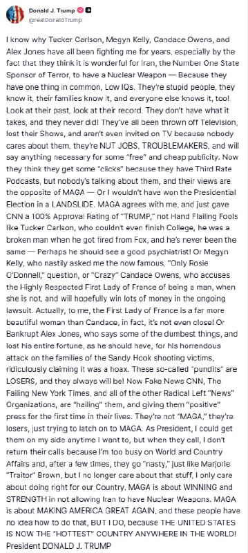 Trump lashes out at Tucker Carlson, Megyn Kelly, Candace Owens, and Alex Jones in a long Truth Social post:They have one thing in common — low IQs.They’re stupid people… everyone knows it.