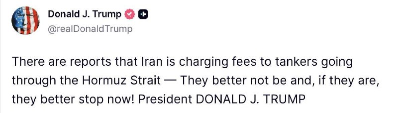 BREAKING: Trump:There are reports that Iran is charging fees to tankers going through the Hormuz Strait — They better not be and, if they are, they better stop now!