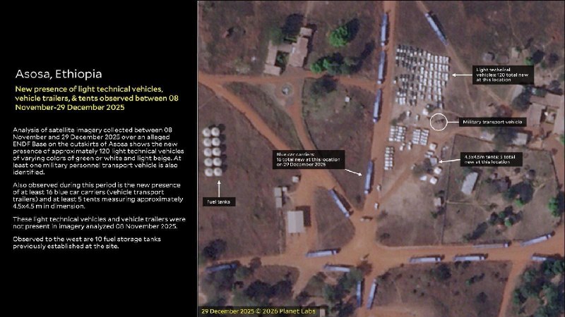 A new report from the Yale Humanitarian Research Lab (HRL) says satellite imagery strongly suggests that an Ethiopian military base near Asosa, close to the Sudan border, has been providing logistical support to Sudan’s UAE-backed Rapid Support Forces (RSF) over the past five months.Researchers identified multiple indicators of assistance, including:— Delivery and unloading of pickup-style “techn...