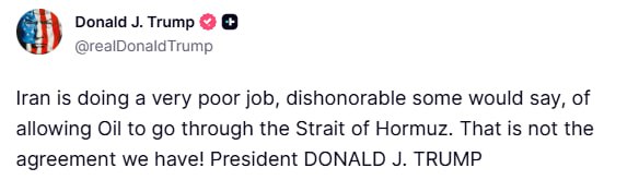 Trump:Iran is doing a very poor job, dishonorable some would say, of allowing Oil to go through the Strait of Hormuz. That is not the agreement we have!,