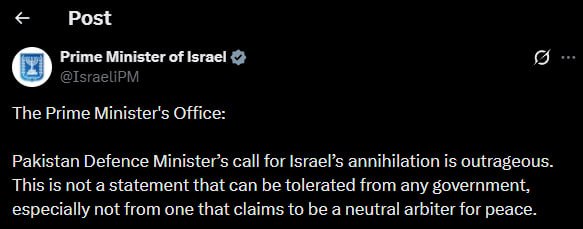 Netanyahu’s Office:Pakistan Defence Minister’s call for Israel’s annihilation is outrageous.This is not a statement that can be tolerated from any government, especially not from one that claims to be a neutral arbiter for peace.