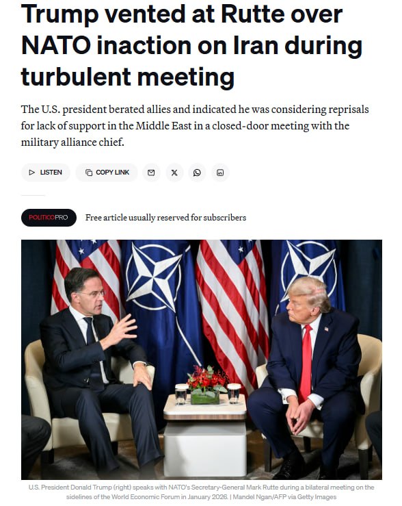 Trump lashed out at NATO allies in a tense closed-door meeting with Secretary-General Mark Rutte, criticizing their refusal to support the Iran conflict.“It went shit… nothing but a tirade of insults,” one European official said, adding Trump “apparently threatened to do just about anything.”Source: POLITICO