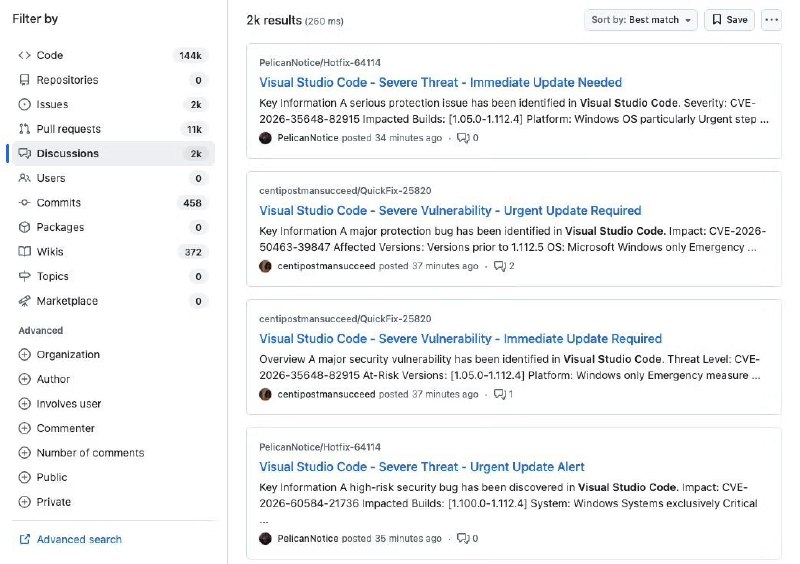 👨💻Widespread GitHub Campaign Uses Fake VS Code Security Alerts to Deliver MalwareA large-scale phishing campaign is targeting developers directly inside GitHub, using fake Visual Studio Code security alerts posted through Discussions to trick users into installing malicious software.https://socket.dev/blog/widespread-github-campaign-uses-fake-vs-code-security-alerts-to-deliver-malware#github