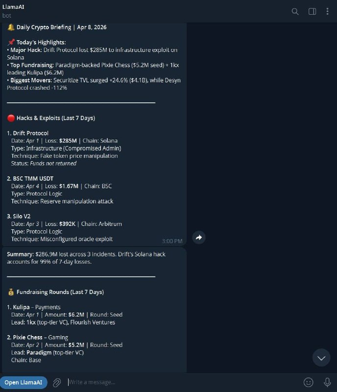 LlamaAI alerts are now available in Telegram.How it works:1) Ask LlamaAI to send you a daily alert with onchain trends, DeFi news, or anything else crypto related2) Set the Delivery method to Telegram3) Enable the LlamaAI bot when prompted and you're all set