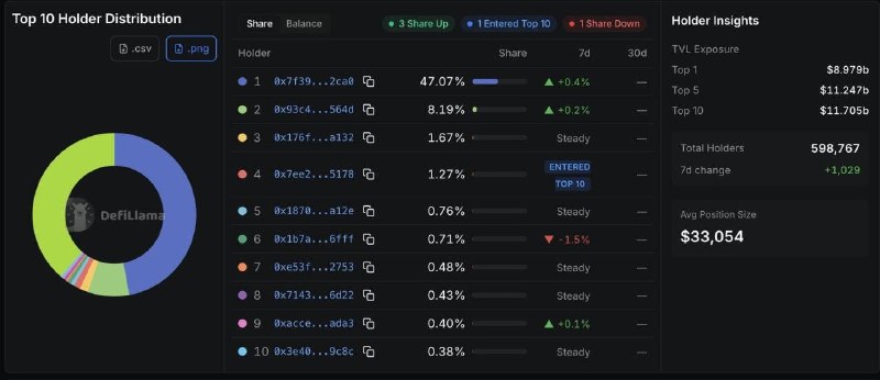 How concentrated are a DeFi pool's depositors?Holder data is now available on DefiLlama yield pools. This includes:* Holder Distribution* Top Wallets* TVL exposure from the top 1, 5, and 10 holders* Number of holders and recent trend