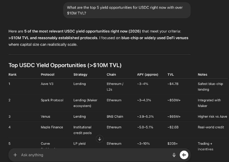 We asked LlamaAI and a general purpose LLM to both find the top yield opportunities for USDC.While LlamaAI has direct access to real-time DeFi data through DefiLlama, general LLMs are limited to a web search.Try for yourself with a 7-day trial now.https://defillama.com/ai