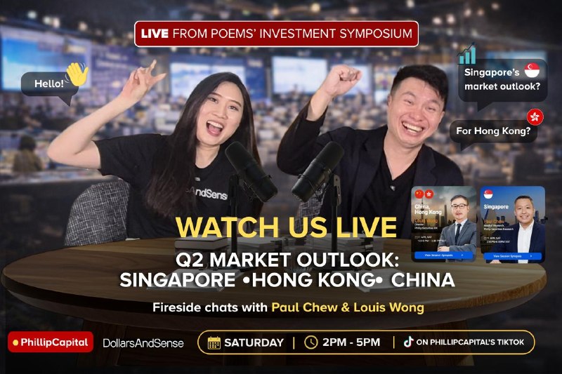 LIVE FROM POEMS’ INVESTMENT SYMPOSIUM🎥Can’t make it down in person?Catch uslive tomorrowatPOEMS’ Q2 Market Outlookfrom2pm to 5pm, streaming onPhillipCapital’s TikTok.We’ll be chatting about theSingapore, Hong Kong and China market outlook, with fireside conversations featuringPaul ChewandLouis Wong.Plus, win exclusive prizes during the livestream!